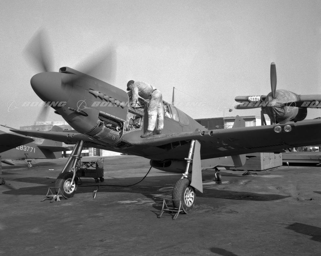 North American Aviation's powerful and agile P-51 was the first single-engine aircraft based in England to penetrate Nazi Germany during World War II. With its superior aerodynamics, the Mustang outperformed enemy planes and went on to establish an impressive aerial record. It first flew in 1941 and was initially designed for the British Royal Air Force for fighter reconnaissance. By war's end North American built 15,575 P-51 Mustangs. The P-51D Mustang had a wingspan of 37 feet and was 32 feet long. Powered by one 1,490- horsepower engine, it flew 437 mph with a range of 2,300 miles.