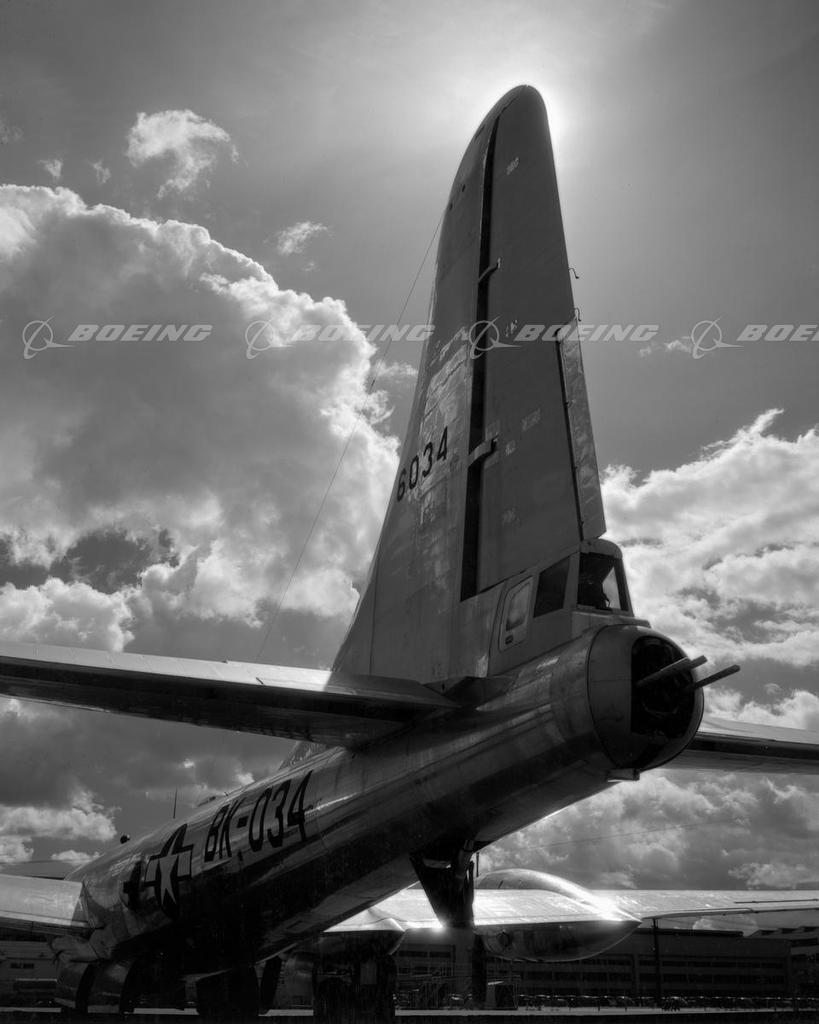 The four-engine, propeller-powered B-50 bomber, which first flew in 1947, was among the last piston-powered bombers built during an era that was to be dominated by jets. However, in 1949, the B-50A, the Lucky Lady II, made the first nonstop flight around the world in 94 hours, refueled in flight four times by KB-29Ms. The B-50 originally evolved from the B-29D but because it included so many improvements, it was redesignated the B-50A, with 59 percent more power than the B-29. The next version, the B-50B, fitted with cameras and wing tanks, was designated RB-50B and used for strategic reconnaissance. The B-50D, the most common variant, was distinguished by a one-piece transparent-plastic nose molding and an optically flat bombardier’s window in the lower portion. Some B50s were later converted to hose-type KB-50 aerial tankers, their speed enhanced by the addition of two 5,200-pound-thrust jet engines, so at 400 mph, they could refuel jet aircraft. One KB-50D became a drone to test Bell XGAM missiles and 36 became long-range reconnaissance aircraft (WB-50D).