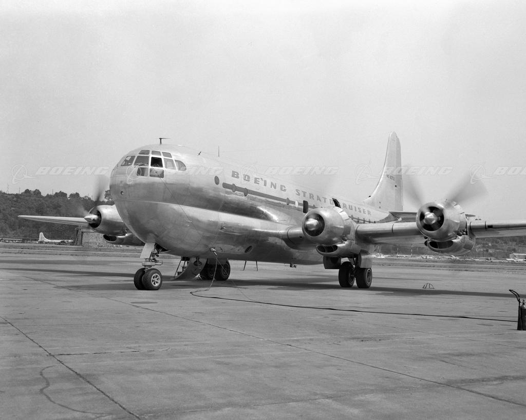 The 377 Stratocruiser was the last of the Boeing propeller-powered luxury airliners. Known as the First Lady of the Airways, it first flew in 1947 as the elegant, civilian offspring of the C-97, a military freighter that carried soldiers and equipment during World War II. A circular stairway led from the cabin to a lower deck luxury lounge. As a sleeper, it held 28 upper- and lower-bunk units. The first Stratocruiser began service in 1949 between San Francisco to Honolulu. Only five years later, the Boeing Dash 80 prototype for the Model 707 made its first flight, and the Stratocruiser became obsolete. It found a new career as special transport for large sections of spacecraft. With its fuselage swollen by a superstructure, the once-elegant Stratocruiser became known as the Pregnant Guppy and, even larger, as the Super Guppy.