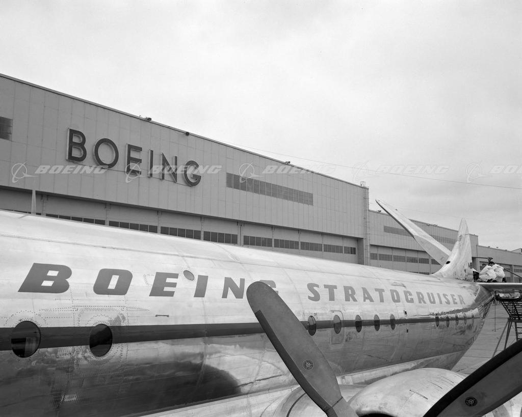 The 377 Stratocruiser was the last of the Boeing propeller-powered luxury airliners. Known as the First Lady of the Airways, it first flew in 1947 as the elegant, civilian offspring of the C-97, a military freighter that carried soldiers and equipment during World War II. A circular stairway led from the cabin to a lower deck luxury lounge. As a sleeper, it held 28 upper- and lower-bunk units. The first Stratocruiser began service in 1949 between San Francisco to Honolulu. Only five years later, the Boeing Dash 80 prototype for the Model 707 made its first flight, and the Stratocruiser became obsolete. It found a new career as special transport for large sections of spacecraft. With its fuselage swollen by a superstructure, the once-elegant Stratocruiser became known as the Pregnant Guppy and, even larger, as the Super Guppy.