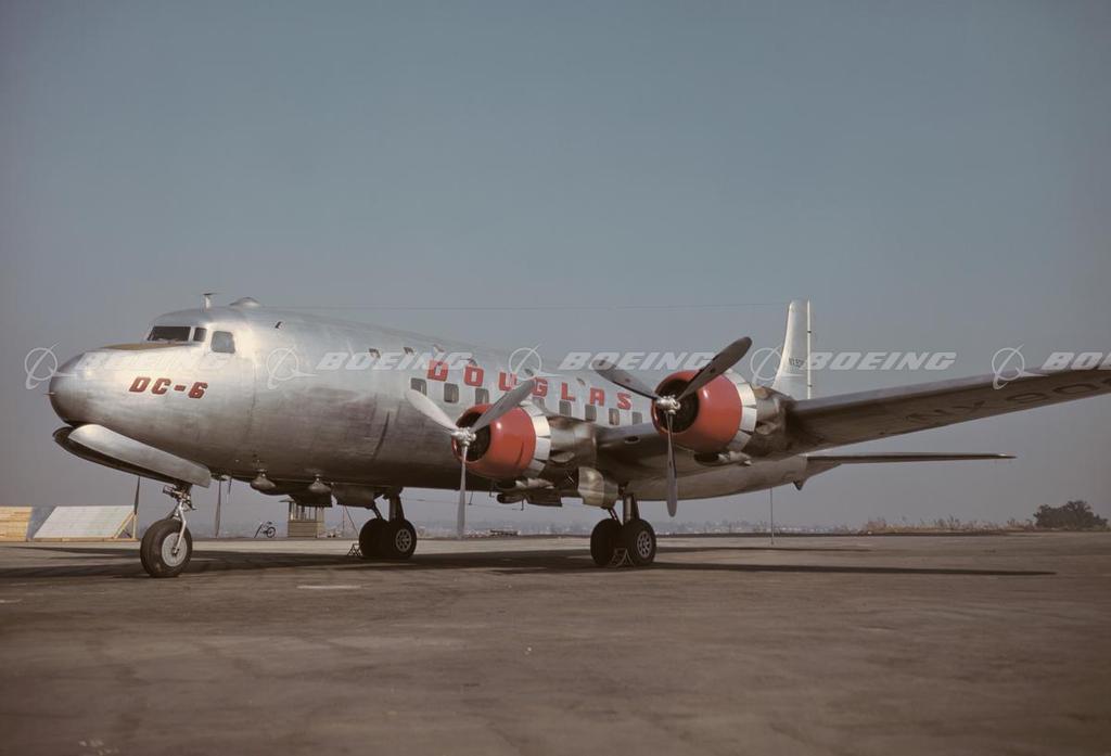 Douglas DC-6 (1946-1958): Nearly identical to the DC-4 in appearance, the DC-6 was first conceived as a long-range military transport. The plane made its maiden flight on February 15, 1946. The key difference between the DC-4 and DC-6 was the DC-6’s larger engines, which were twice as powerful as the engines on the DC-4. The DC-6 was the first Douglas airliner with a pressurized cabin, which enabled it to fly higher and faster, thus taking its passengers “over the weather.” The DC-6 was the most economical commercial aircraft of the propeller era. Its operating costs were among the lowest until jetliners came on the scene. Military versions were produced under the designations C-118 (Air Force) and R6D (Navy). President Harry Truman chose a DC-6 for official use, and christened it the “Independence,” for his hometown in Missouri. During its 12-year production run, Douglas delivered 537 DC-6s, plus 167 military versions.