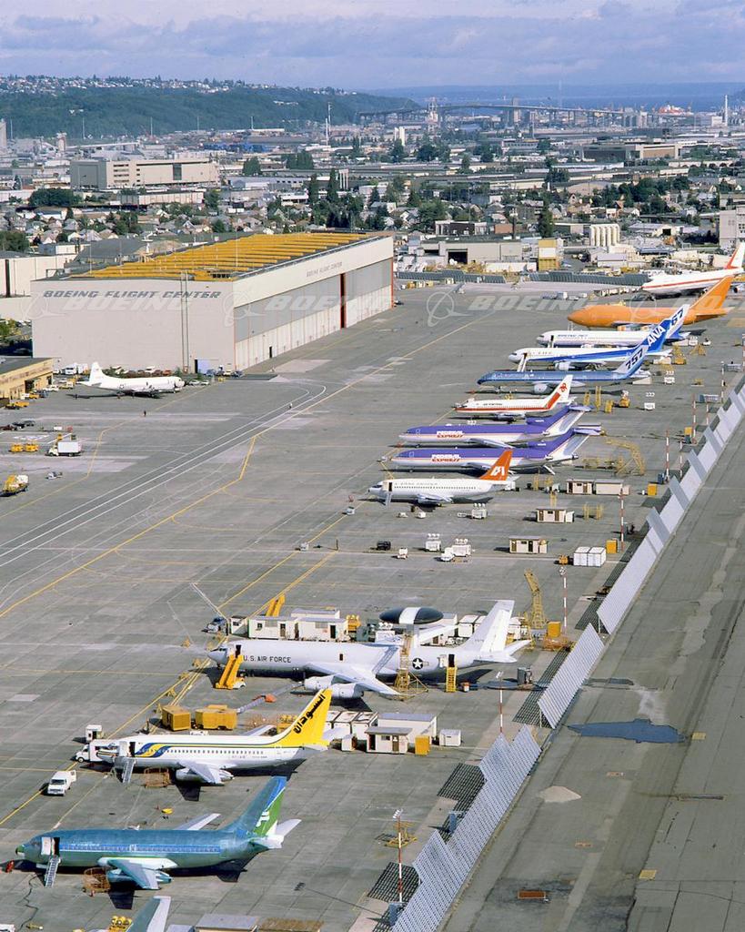 The jets on the Boeing Field flight line in this 1983 photo represent Boeing's 7 series airplanes of the time. The airplanes on display include an E-3 AWACS built on the 707 platform, 727, 737, 747, 757 and 767 airplanes.