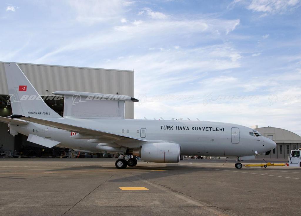 A newly painted Peace Eagle Airborne Early Warning and Control (AEW&C) aircraft is shown in Turkish Air Force colors outside a Boeing hangar in Seattle, WA. The aircraft was to make its first international flight November 2007 when it traveled to the Dubai Air Show in the United Arab Emirates, for a static display Nov. 11-15. Boeing is building the first of four AEW&C aircraft for Turkey's Peace Eagle program in Seattle while Turkish Aerospace Industries in Ankara, Turkey, is building the remaining three aircraft with significant participation from various Turkish industry suppliers. Functional checkout of the mission systems is under way with development flight testing beginning in 2008.