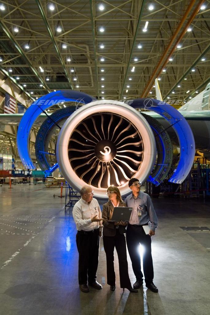 Boeing Engineers with 777 Engine in Factory