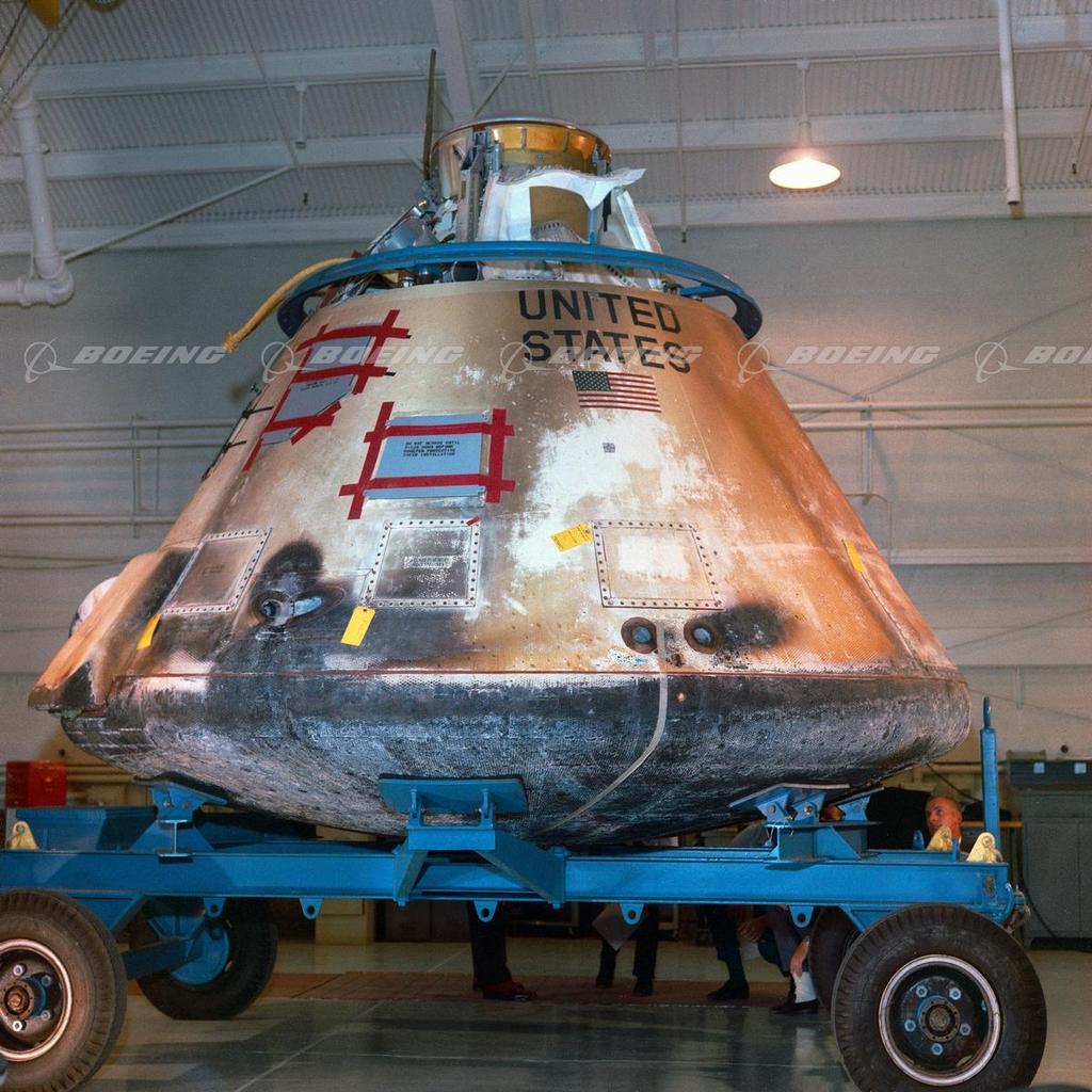 The Apollo program sent nine expeditions to the Moon. Six landed 12 astronauts on the lunar surface, starting July 20, 1969. North American developed the conical command module, where the crew rode; a cylindrical service module; and the service propulsion system. The last Apollo Moon mission was Dec. 7 to 19, 1972. Three Apollo command and service modules were used on the Skylab program, and the last Apollo mission was in July 1975, for the Apollo-Soyuz test project.