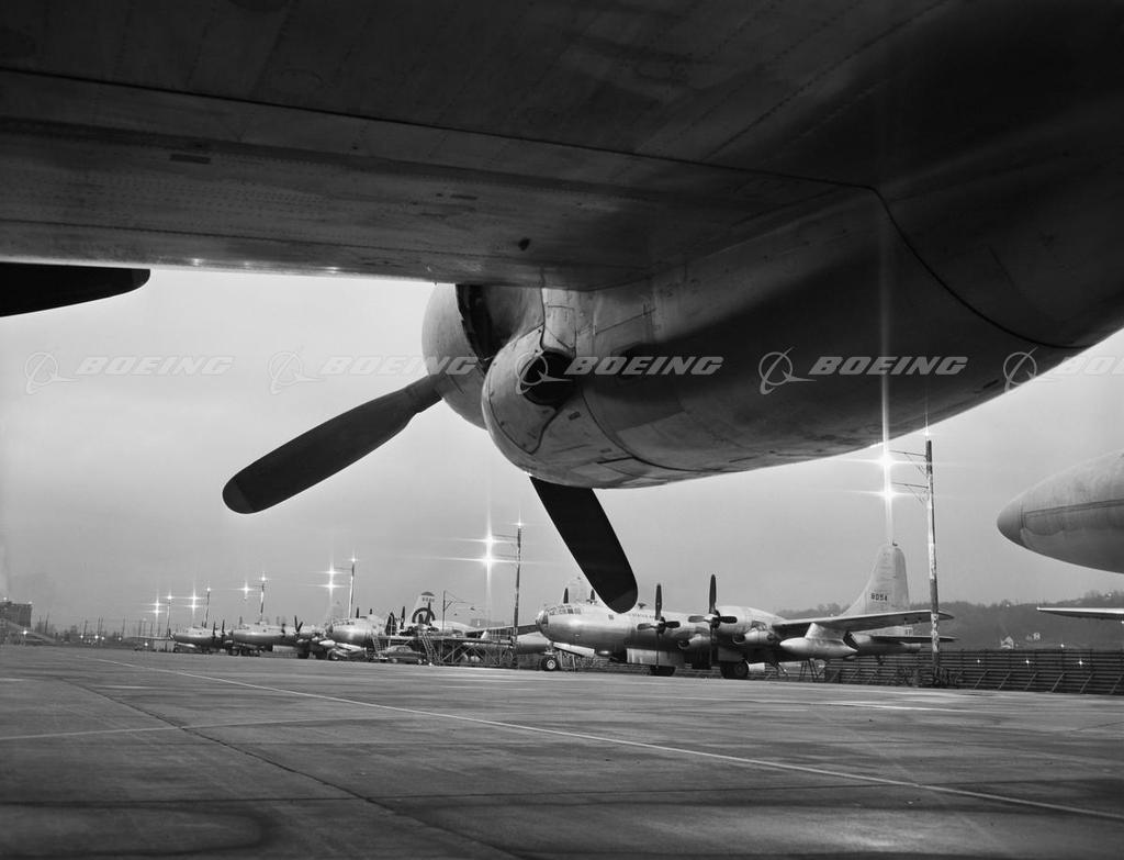 The four-engine, propeller-powered B-50 bomber, which first flew in 1947, was among the last piston-powered bombers built during an era that was to be dominated by jets. However, in 1949, the B-50A, the Lucky Lady II, made the first nonstop flight around the world in 94 hours, refueled in flight four times by KB-29Ms. The B-50 originally evolved from the B-29D but because it included so many improvements, it was redesignated the B-50A, with 59 percent more power than the B-29. The next version, the B-50B, fitted with cameras and wing tanks, was designated RB-50B and used for strategic reconnaissance. The B-50D, the most common variant, was distinguished by a one-piece transparent-plastic nose molding and an optically flat bombardier’s window in the lower portion. Some B50s were later converted to hose-type KB-50 aerial tankers, their speed enhanced by the addition of two 5,200-pound-thrust jet engines, so at 400 mph, they could refuel jet aircraft. One KB-50D became a drone to test Bell XGAM missiles and 36 became long-range reconnaissance aircraft (WB-50D).