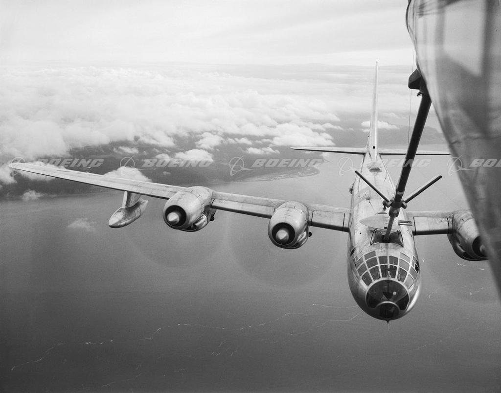 The four-engine, propeller-powered B-50 bomber, which first flew in 1947, was among the last piston-powered bombers built during an era that was to be dominated by jets. However, in 1949, the B-50A, the Lucky Lady II, made the first nonstop flight around the world in 94 hours, refueled in flight four times by KB-29Ms. The B-50 originally evolved from the B-29D but because it included so many improvements, it was redesignated the B-50A, with 59 percent more power than the B-29. The next version, the B-50B, fitted with cameras and wing tanks, was designated RB-50B and used for strategic reconnaissance. The B-50D, the most common variant, was distinguished by a one-piece transparent-plastic nose molding and an optically flat bombardier’s window in the lower portion. Some B50s were later converted to hose-type KB-50 aerial tankers, their speed enhanced by the addition of two 5,200-pound-thrust jet engines, so at 400 mph, they could refuel jet aircraft. One KB-50D became a drone to test Bell XGAM missiles and 36 became long-range reconnaissance aircraft (WB-50D).
