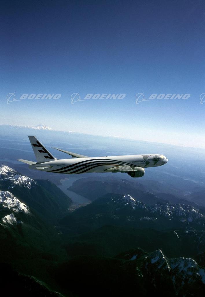The wide-body Model 777 was the first commercial jet that was 100 percent digitally designed using three-dimensional solids technology. It earned the Collier Trophy for top aeronautical achievement in 1996. The twinjet commercial transport uses fuel efficiently, and its comfortable cabin is very popular with passengers. The 777-200 can take 305 passengers 5,995 miles. The 777-300 can carry 368 passengers 6,899 miles. Launched in February 2000, the 777-200LR and 777-300ER will fly 9,420 or 7,880 nautical miles, respectively.