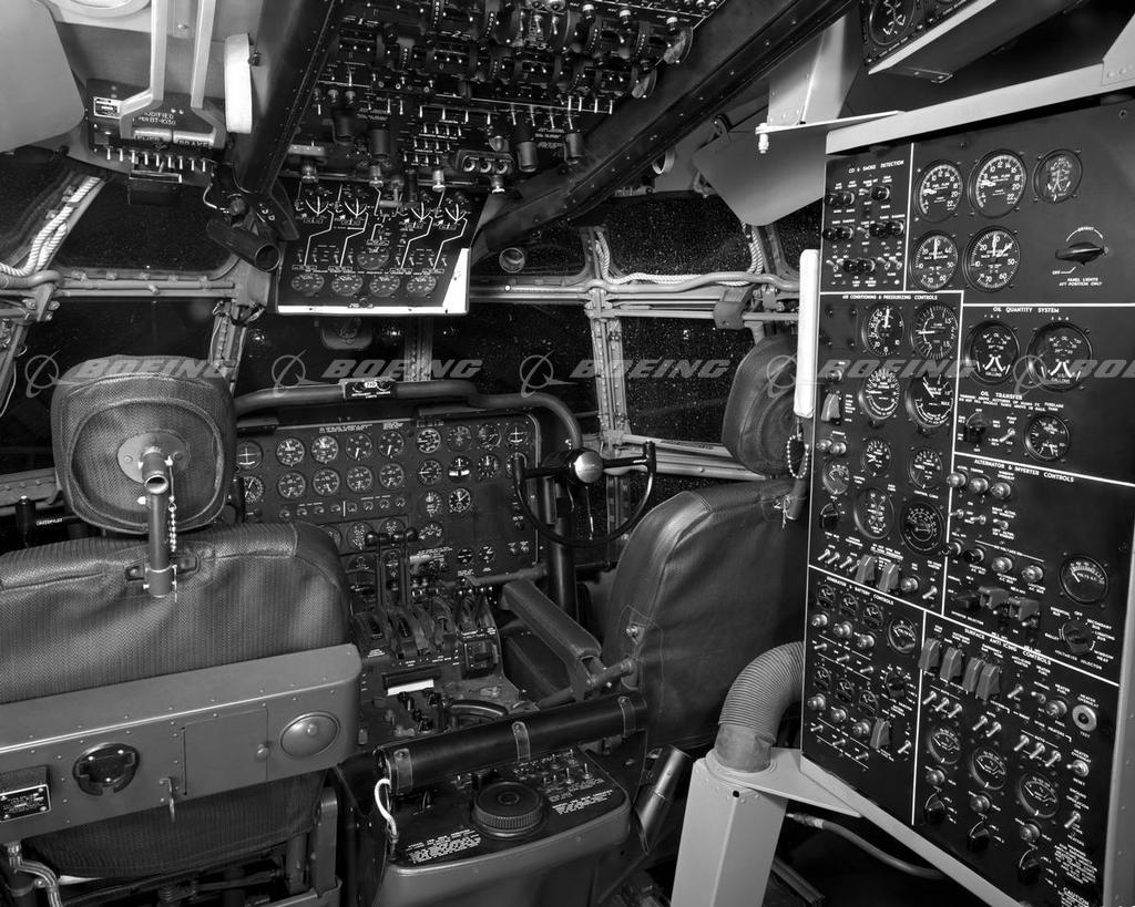 The 377 Stratocruiser was the last of the Boeing propeller-powered luxury airliners. Known as the First Lady of the Airways, it first flew in 1947 as the elegant, civilian offspring of the C-97, a military freighter that carried soldiers and equipment during World War II. A circular stairway led from the cabin to a lower deck luxury lounge. As a sleeper, it held 28 upper- and lower-bunk units. The first Stratocruiser began service in 1949 between San Francisco to Honolulu. Only five years later, the Boeing Dash 80 prototype for the Model 707 made its first flight, and the Stratocruiser became obsolete. It found a new career as special transport for large sections of spacecraft. With its fuselage swollen by a superstructure, the once-elegant Stratocruiser became known as the Pregnant Guppy and, even larger, as the Super Guppy.