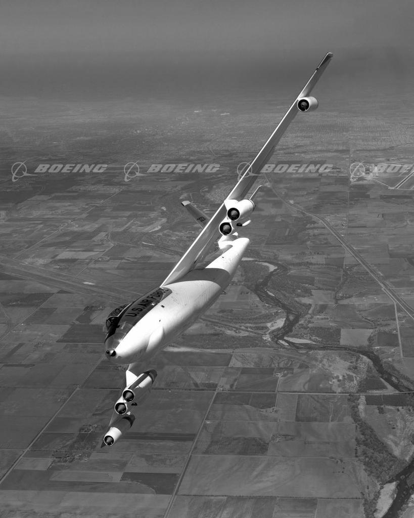 At the time of its first flight, Dec. 17, 1947, the B-47 Stratojet represented a radical departure from traditional design, and it set the design standards for all large jet aircraft until the present time. The six-engine Boeing B-47 was America's first multiengine swept-wing jet bomber. Its thin 116-foot wing was extraordinarily flexible and swept back at a 35-degree angle. Eighteen small rocket units in the fuselage provided jet-assisted takeoff (JATO), and parachutes cut its landing speeds. Later models were powered by 5,200-pound-thrust axial-flow jet engines, and top speeds were 600 mph. A total of 2,032 B-47s in all versions were built.