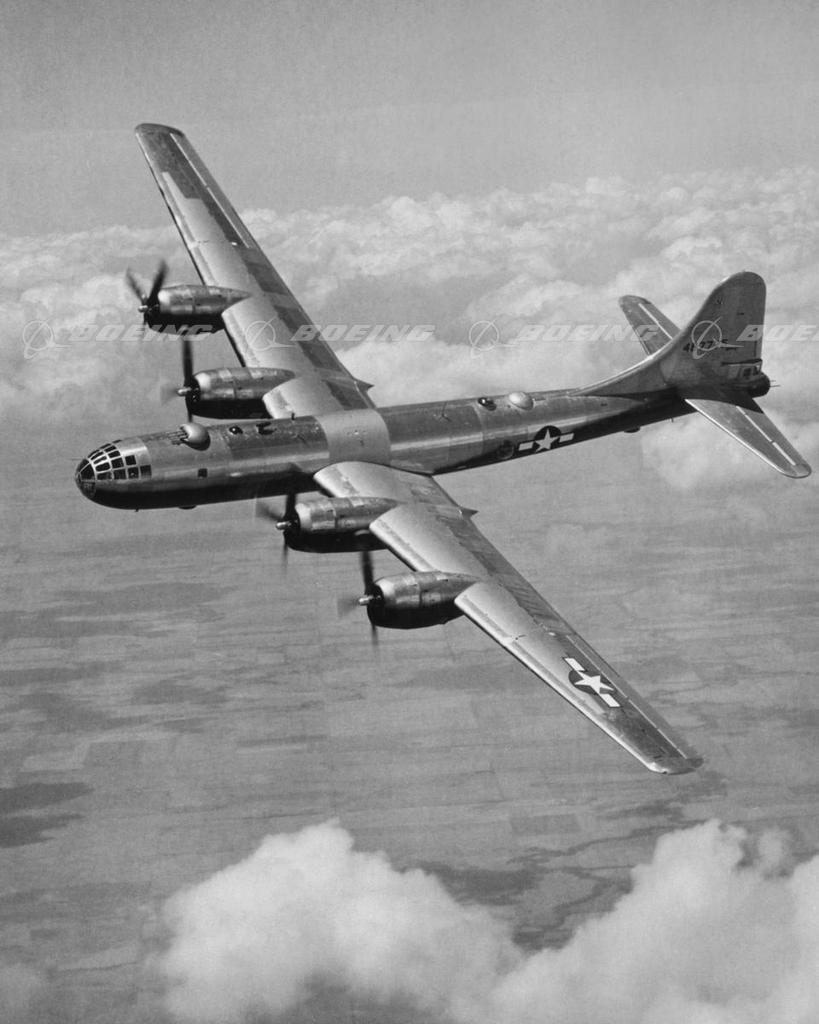 The Boeing B-29, the most technologically advanced airplane produced during World War II, first flew Sept. 21, 1942. At 105,000 pounds, it was the world’s heaviest production airplane. It was the first bomber with crew-cabin pressurization and remotely controlled power turrets. A total of 3,970 B-29s were built, with improvements added to the bombers as they went through the production line as data came in from pilots in action. World War II ended when two B-29s, the Enola Gay and Bockscar dropped atomic bombs on Hiroshima and Nagasaki.