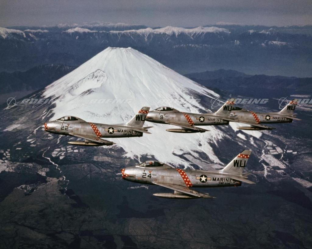 Four Marine FJ-2 Furies Flying in Formation in Front of Mt. Fuji