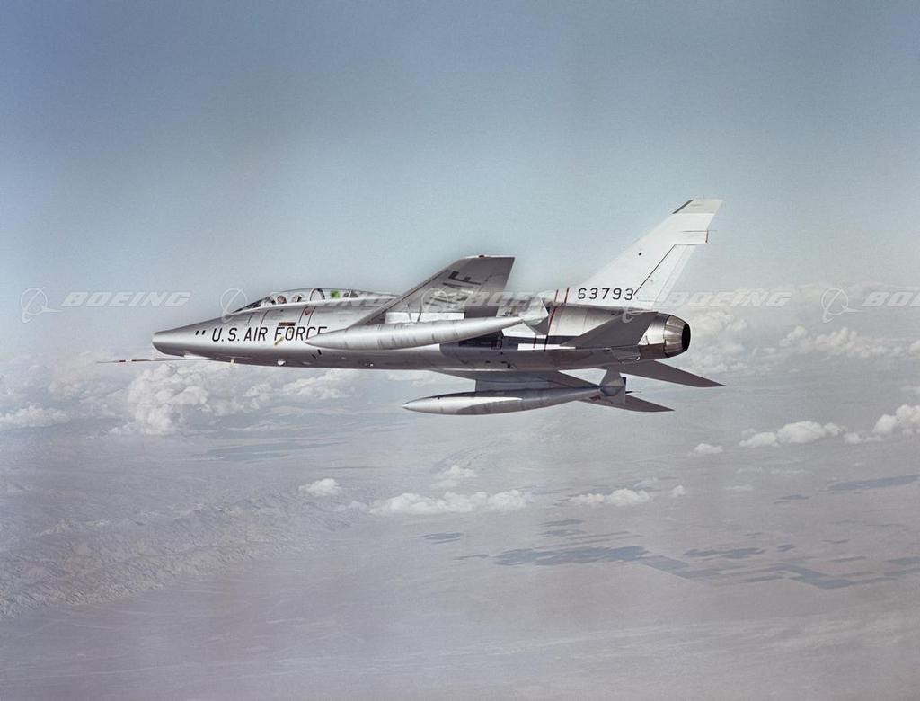 North American Aviation’s F-100 Super Sabre first flew May 25, 1953, and was the first operational fighter in the world capable of maintaining supersonic speed in level flight. Of the 2,290 Super Sabres, 1,274 F-100Ds included the first autopilot designed for a supersonic jet. Powered by a 16,950-pound-thrust afterburning jet engine, the F-100 was armed with four 20-millimeter cannons, two GAM 83A Bulldog missiles, four Sidewinder missiles, rockets, special stores, and/or 7,040 pounds of bombs.