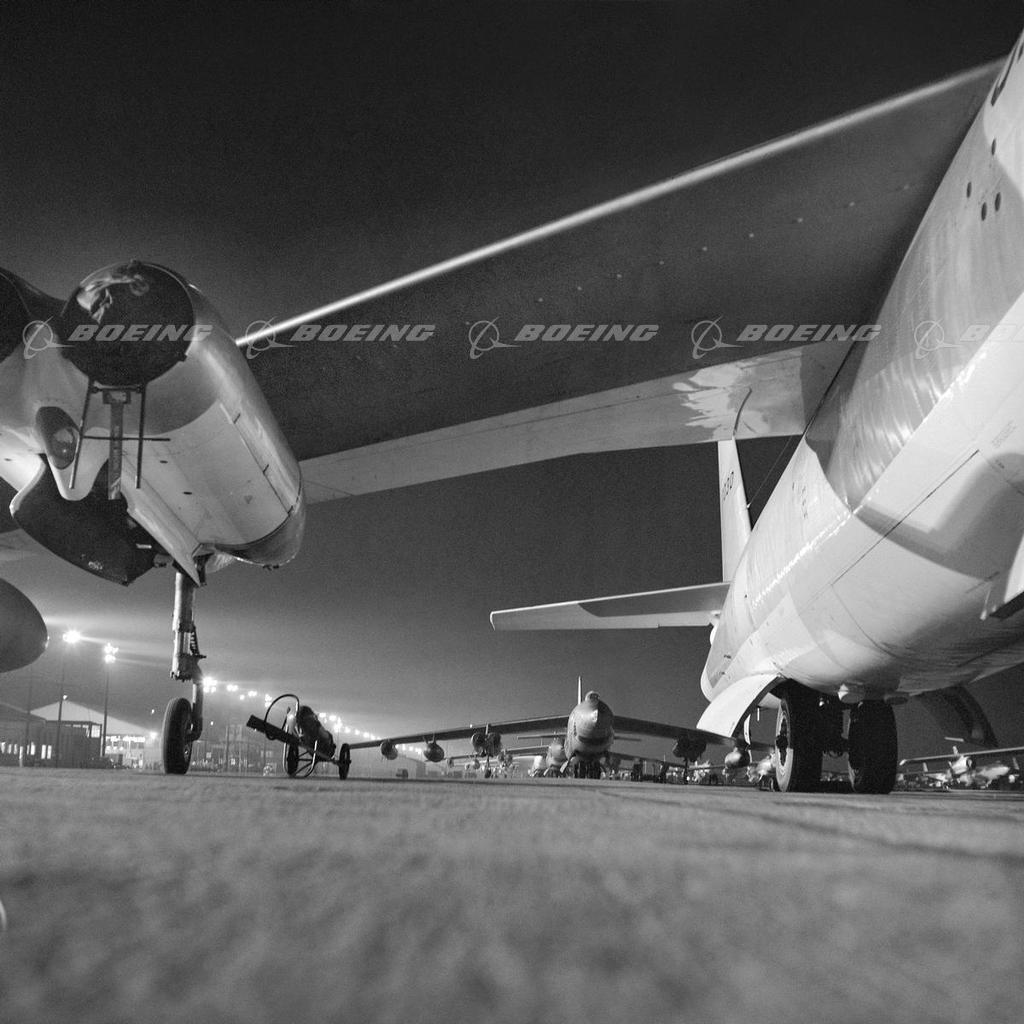 At the time of its first flight, Dec. 17, 1947, the B-47 Stratojet represented a radical departure from traditional design, and it set the design standards for all large jet aircraft until the present time. The six-engine Boeing B-47 was America’s first multiengine swept-wing jet bomber. Its thin 116-foot wing was extraordinarily flexible and swept back at a 35-degree angle. Eighteen small rocket units in the fuselage provided jet-assisted takeoff (JATO), and parachutes cut its landing speeds. Later models were powered by 5,200-pound-thrust axial-flow jet engines, and top speeds were 600 mph. A total of 2,032 B-47s in all versions were built.