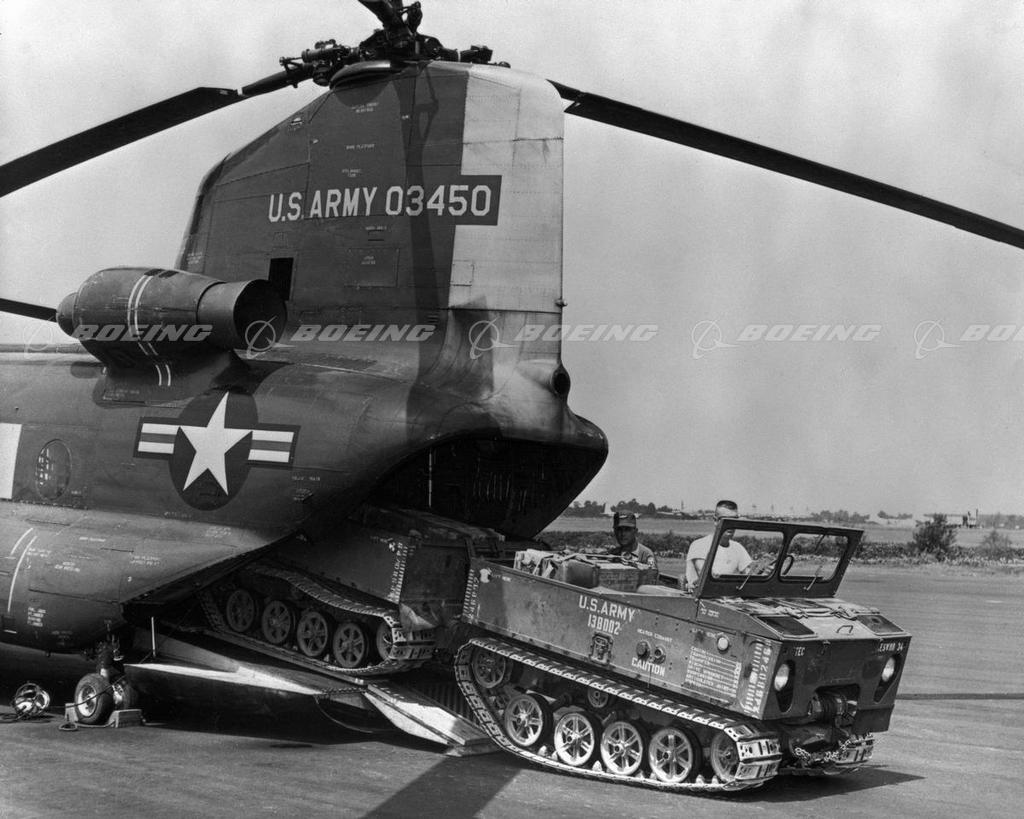 A United States Army CH-47A Chinook, produced by The Boeing Company's Vertol Division, demonstrated its versatility as the U.S. Army's standard medium helicopter when it participated in a series of compatibility tests with an XM-571 articulated personnel carrier at Fort-Bragg, North Carolina in the 1960s. The XM-571 is a light land vehicle designed to carry payloads of 2,000 pounds over virtually all types of terrain under the most adverse weather conditions. Gross weight of the vehicle and its cargo during the compatibility tests totaled over 7,500 pounds. Shown above is the XM-571 being backed into the Chinook's straight-in rear loading ramp. In another test, the tandem-rotor helicopter air lifted the vehicle on its 16,000 pound capacity cargo hook, released the XM-571 from the hook, allowing the vehicle to descend by parachute.