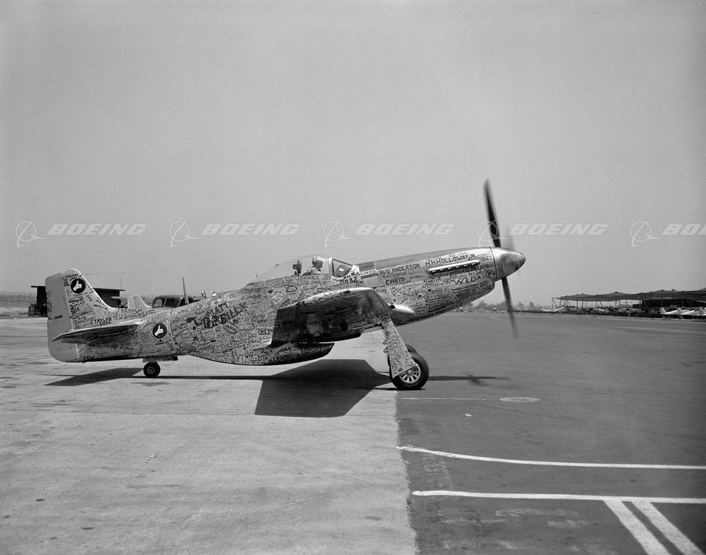 The early versions of the fast and powerful P-51 Mustang looked very different from the P-51D and later versions. The initial P-51 “razorback” design buried the pilot inside the airplanes for less drag, while the P-51D, while also very efficient aerodynamically, was the first to use a “teardrop” bubble canopy and cut-down rear fuselage. North American Aviation’s agile P-51 was the first single-engine aircraft based in England to penetrate Nazi Germany during World War II. With its superior design, the Mustang outperformed enemy planes and went on to establish an impressive aerial record. Initially designed for the British Royal Air Force for fighter reconnaissance, it first flew in 1941. By war’s end North American built 15,575 P-51 Mustangs. The P-51D had a wingspan of 37 feet and was 32 feet long. Powered by one 1,490- horsepower engine, it flew 437 mph with a range of 2,300 miles.