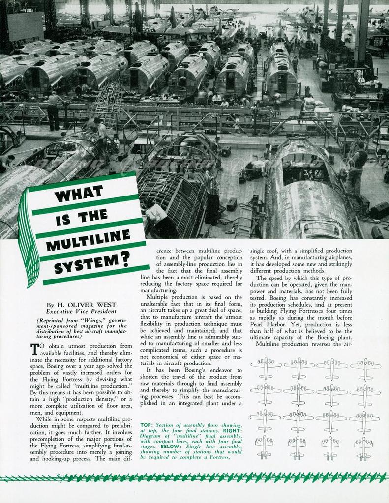 In the early 1940s, Boeing solved the the problem of greatly increased orders for the B-17 Flying Fortress by devising a "multiline production" system to better utilize factory floor space, labor, and equipment. Major portions of the B-17 were pre-assembled and brought to the final assembly area to be joined with the main structure.