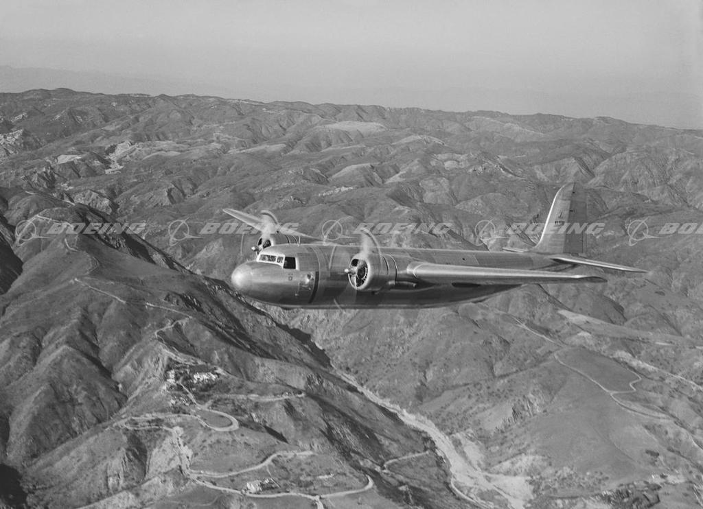 Douglas DC-5 (1939-1941): Development of the DC-5 and the DC-4 began at the same time, but the DC-5 went into production first. The DC-5 was designed as a short-range transport to carry 16 to 22 passengers. Its performance was similar to the DC-3 then being used on longer routes with more passengers. The DC-5 featured a high-wing design and tricycle landing gear. This allowed passengers to step aboard to a level cabin floor just two feet above the ground. The DC-5 was the only Douglas airliner built at the plant in El Segundo, Ca. William E. Boeing bought the first DC-5. He named it “Rover” and used it as an executive aircraft. The next four went to KLM airlines. World War II resulted in the suspension of commercial aircraft deliveries as production was switched to larger and longer-range military transports. The latest seven DC-5s on the line were delivered to the U.S. Nay and Marine Corps under the designation R3D.