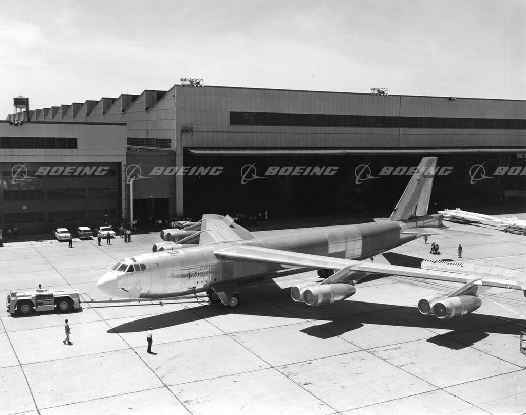 B-52H aircraft 61-040 is shown outside the Boeing assembly line in Wichita in 1962. The company delivered its last B-52 Stratofortress to the U.S. Air Force from its Wichita facility on October 26, 1962. The B-52H, powered by 8 17,000-pound-thrust engines, has a top speed of 650 mph and a range of over 10,000 miles.