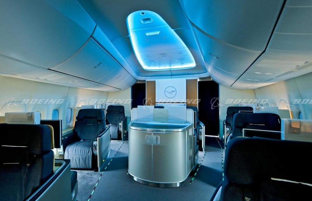 The 747-8 Intercontinental features a new interior with 787-like amenities. The interior incorporates new mood-lighting technology, as well as new lavatories developed for the 787. The newly designed entryway of the 747-8 takes passengers past a concierge station into the elegantly contemporary new interior. A dramatic stairway leads to the upper deck. The new curved, upswept architecture gives passengers great space and comfort, with more room for personal belongings.