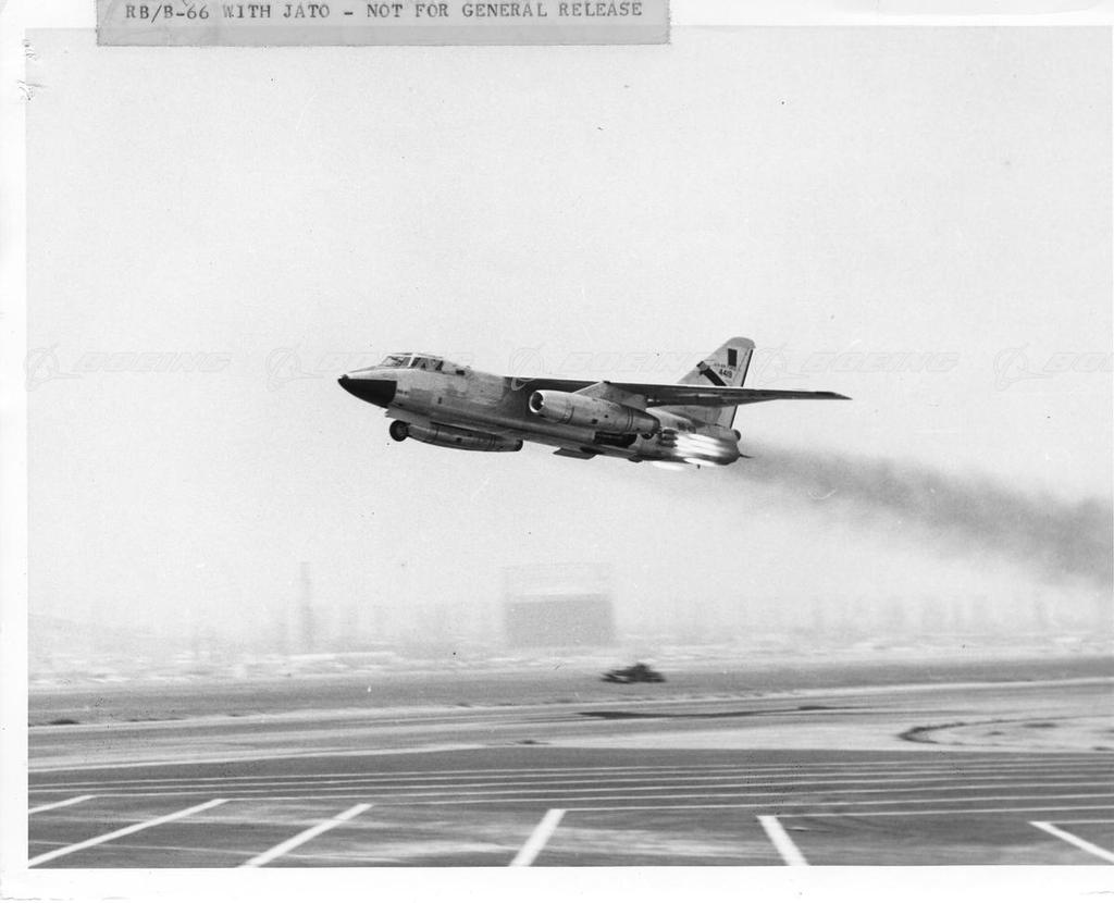 The RB-66 was modified for use in night photo, electronics and weather reconnaissance. This RB-66 had 8 small rocket units in the aft fuselage for jet-assisted takeoff (JATO). The B-66 Destroyer and A-3 Skywarrior were produced in the Douglas Aircraft factory in Long Beach, California.