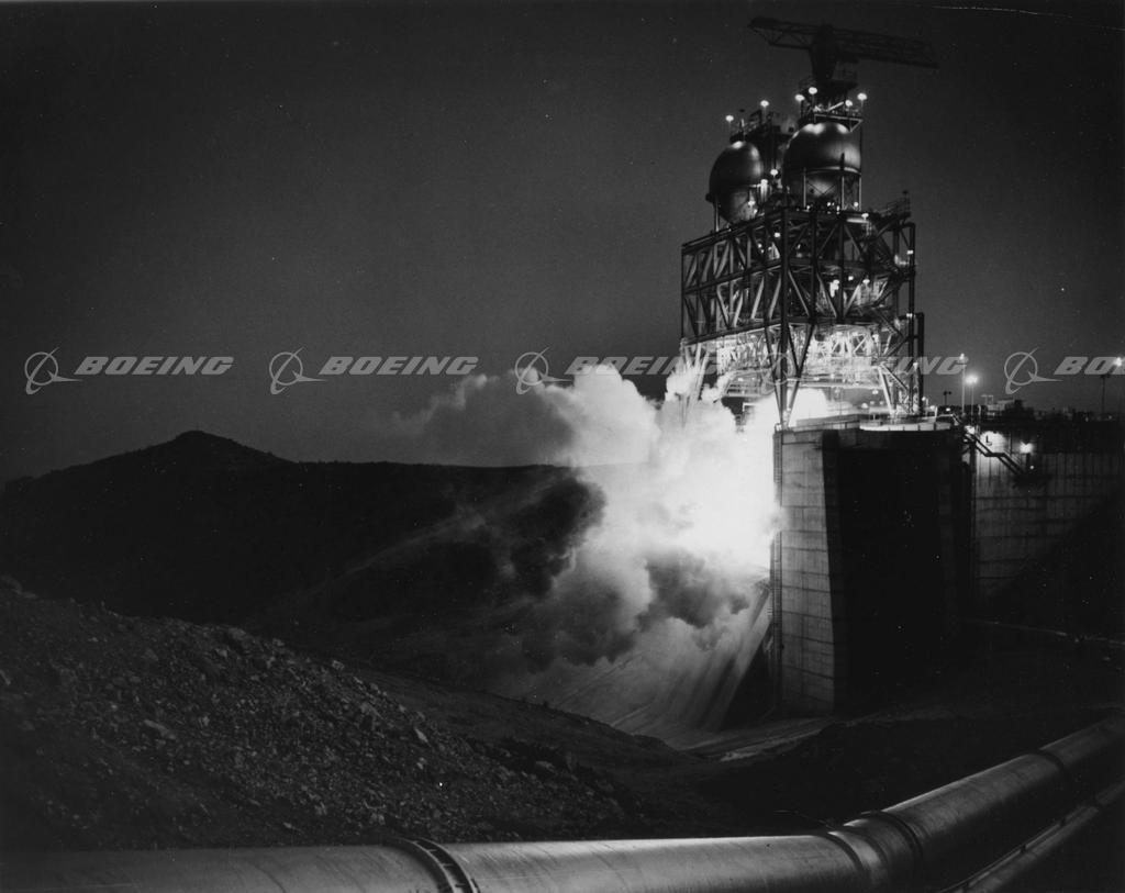 F-1 rocket engine testing at NASA High Thrust Test Area, Edwards Air Force Base, California. F-1 is the most powerful U.S. rocket engine to be placed in production. Developed at Conoga Park, California, by Rocketdyne, a division of North American Aviation, Inc., under the technical direction of NASA's George C. Marshall Space flight Center, Huntsville, Alabama. F-1 was used in a cluster of five to provide 7,500,000 pounds of booster power for the Saturn vehicle that launched the Apollo manned spacecraft to the moon.