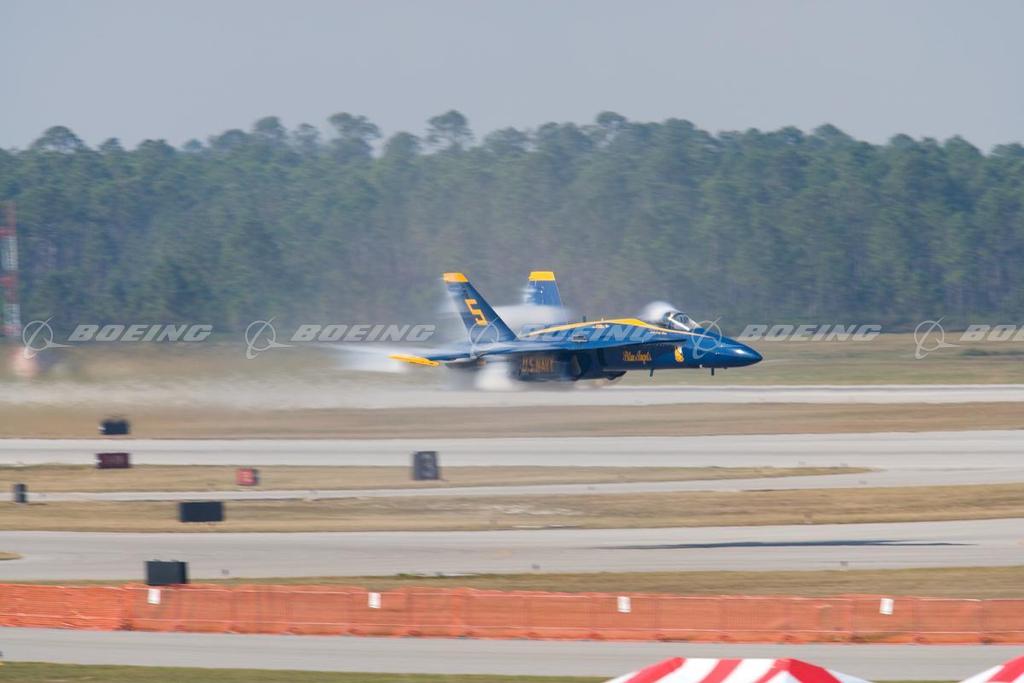 The Blue Angels, the U.S. Navy's flight demonstration team, perform an air show at their home base, Naval Air Station Pensacola, Fla. The Blue Angels fly the Boeing-built F/A-18A/B Hornet.