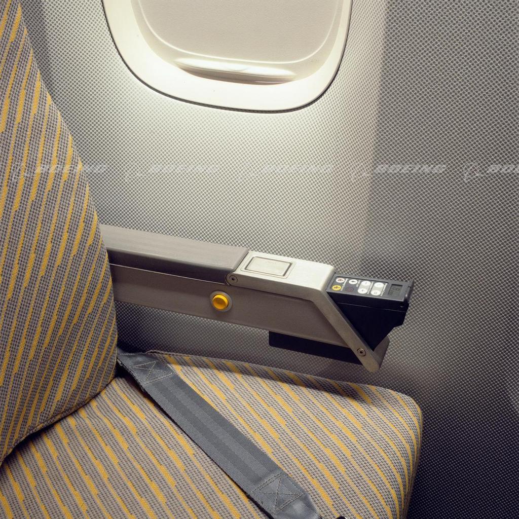The entertainment console in the economy class cabin of a 747 is built into the armrest.