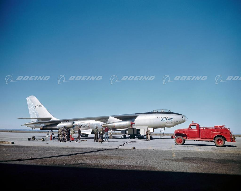 The Boeing B-47 was the country's first swept-wing multi-engine bomber. It represented a milestone in aviation history and a revolution in aircraft design. Every large jet aircraft today is a descendant of the B-47. Because early jet engines could not provide enough thrust for takeoff, the prototype XB-47 had 18 small rocket units in the fuselage for jet-assisted takeoff (JATO). Thrust reversers and anti-skid brakes had not yet been developed, so a ribbon-type drag parachute reduced the B-47 landing speed.