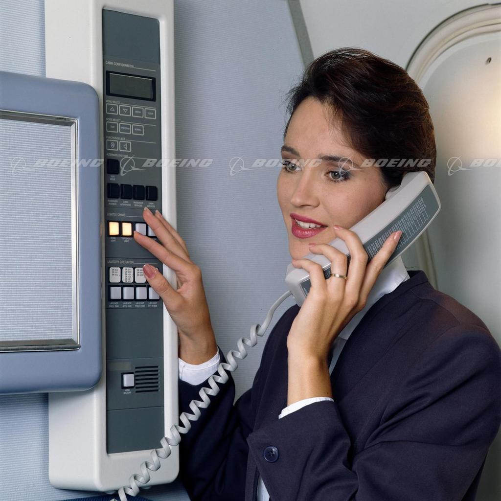 A flight attendent uses the public address system on a 747.