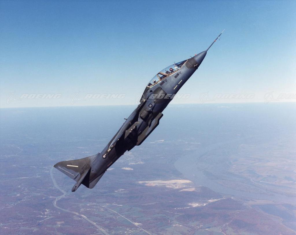 A TAV-8B two-seat trainer climbs through the skies over St. Louis. The front cockpit, where the student sits, is identical to that of an AV-8B. In the rear cockpit, the instructor also has full flight controls. The TAV-8B has an enlarged tail section to make it match the aerodynamic performance of the AV-8B.