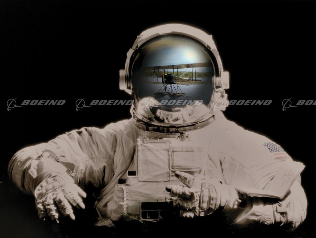 Reflected in the visor of an astronaut's helmet is the B&W biplane, designed and built by company founder William E. Boeing and Navy officer Conrad Westervelt.