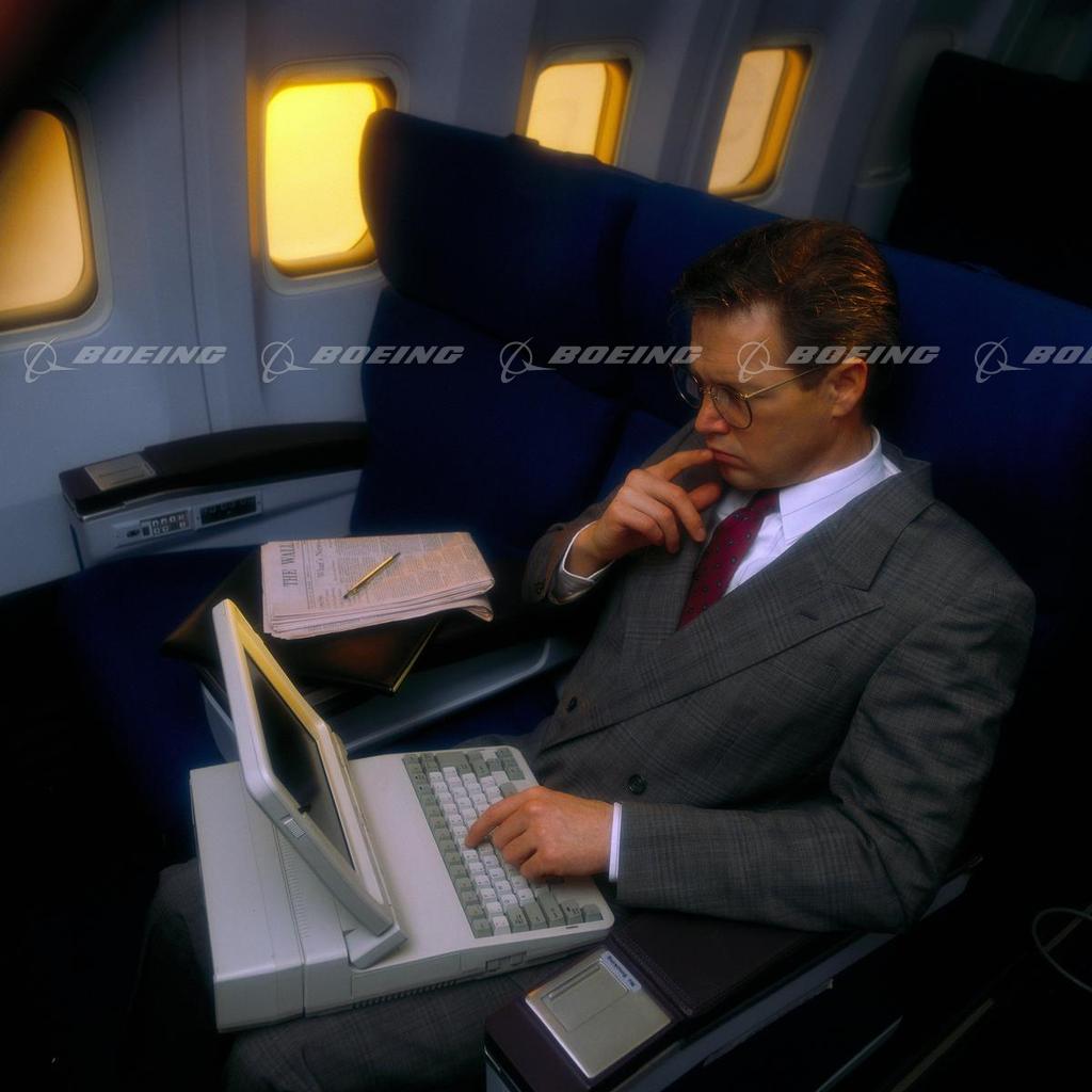 A businessman relaxes in the business class section of the 767-300. The six-abreast seating in business class on 767s is popular because every passenger has either a window or an aisle seat. Seating in this section is typically set at a 38 inch pitch.