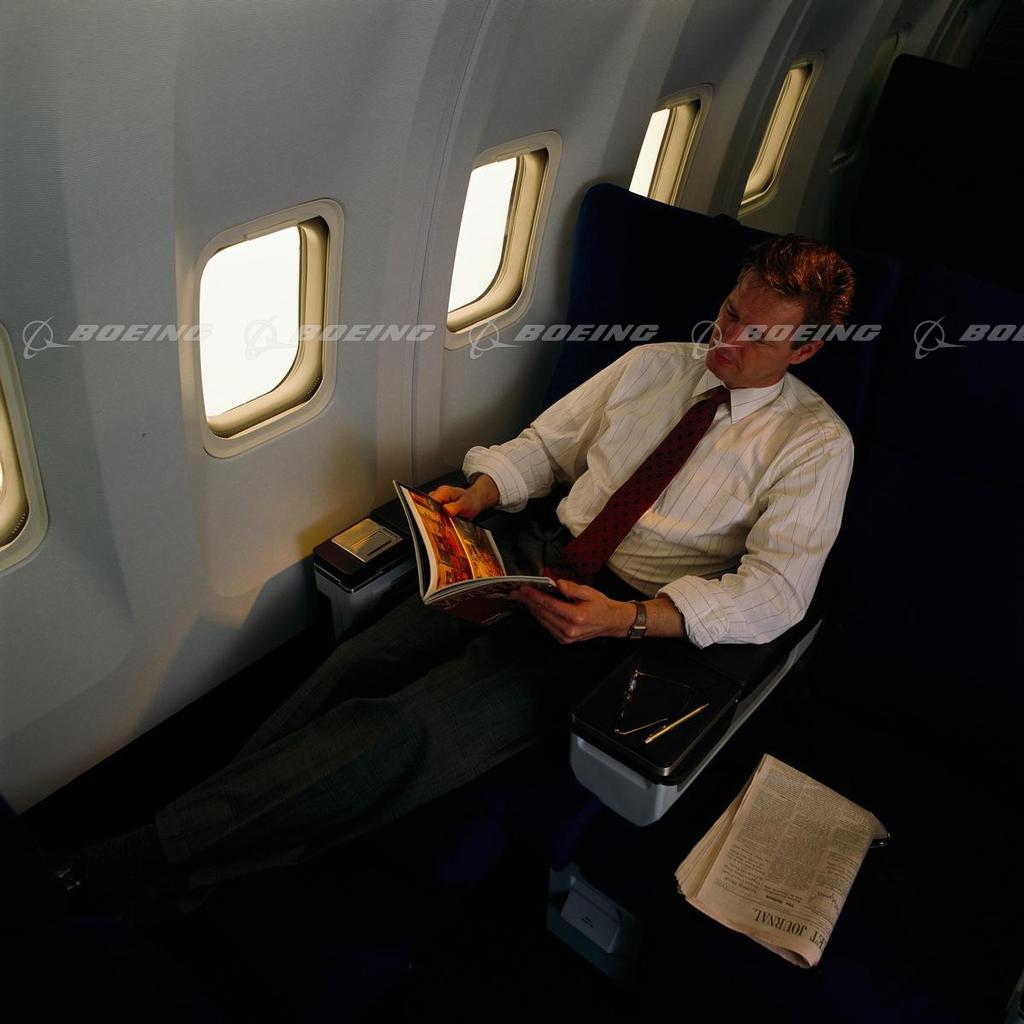 A businessman relaxes in the business class section of the 767-300. The six-abreast seating in business class on 767s is popular because every passenger has either a window or an aisle seat. Seating in this section is typically set at a 38 inch pitch.