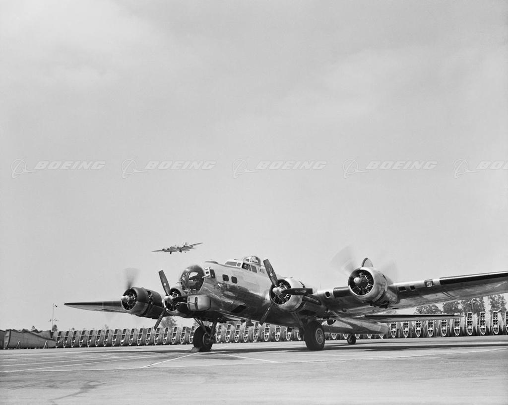 As the storm of World War II shook the world, Boeing-designed B-17 bombers darkened European skies, dropping 640,036 bombs on designated targets. Described by General H. H. Hap Arnold, as the backbone of our worldwide aerial offensive, the B-17 Flying Fortress served in every World War II combat zone. Boeing, Douglas, and Lockheed Vega produced 12,731 B-17s at plants across the country, and the four-engine bombers became legendary for their ability to stay in the air after taking brutal poundings.