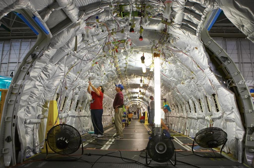 Factory Worker Drilling Floor Panels Inside a 737 Fuselage