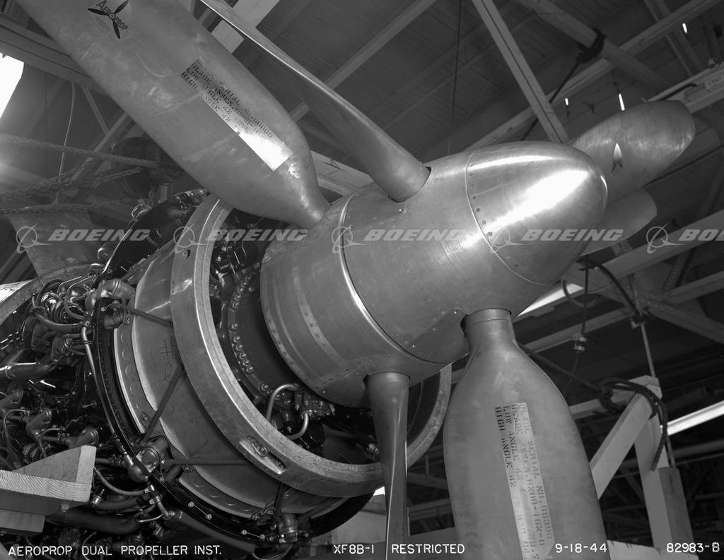 The XF8B-1 fighter-bomber was the heaviest carrier-based airplane built before the end of World War II. It was the first fighter Boeing built after the P-26 Peashooter of 1936 and the last before the F/A-22 in 1990. The XF8B-1 could be flown as a torpedo bomber and, because of its single-seat configuration, could also be used as a fighter. Because of its size and great horsepower, the XF8B-1 used an unusual dual six-blade contrarotating propeller. It carried bombs internally and extra fuel externally, and its six machine guns were mounted inside the folding wings.