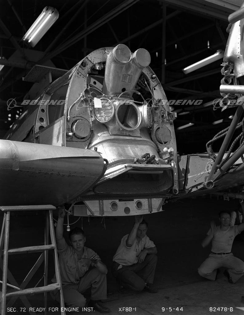 The XF8B-1 fighter-bomber was the heaviest carrier-based airplane built before the end of World War II. It was the first fighter Boeing built after the P-26 Peashooter of 1936 and the last before the F/A-22 in 1990. The XF8B-1 could be flown as a torpedo bomber and, because of its single-seat configuration, could also be used as a fighter. Because of its size and great horsepower, the XF8B-1 used an unusual dual six-blade contrarotating propeller. It carried bombs internally and extra fuel externally, and its six machine guns were mounted inside the folding wings.
