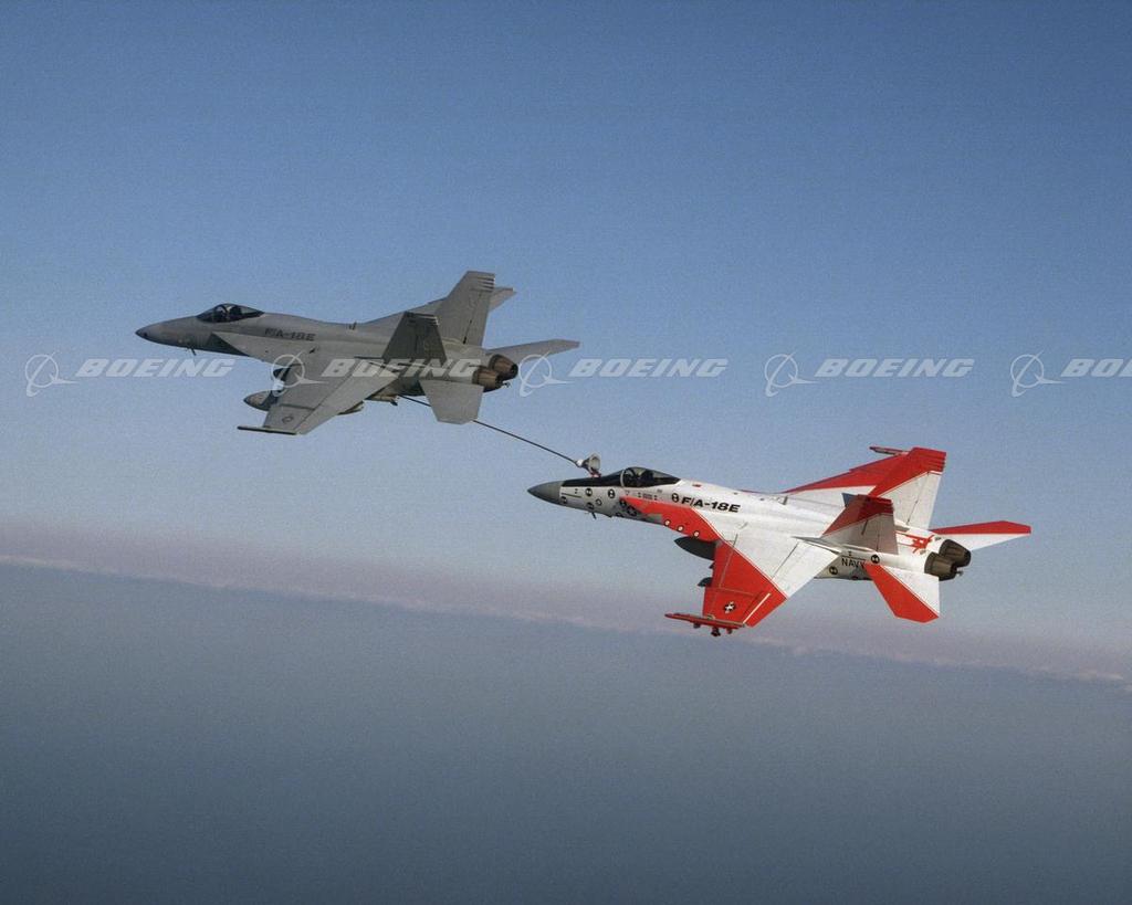 The Super Hornet demonstrates its aerial refueling capability by refueling another Super Hornet in the skies over Naval Air Station Patuxent River, Md.
