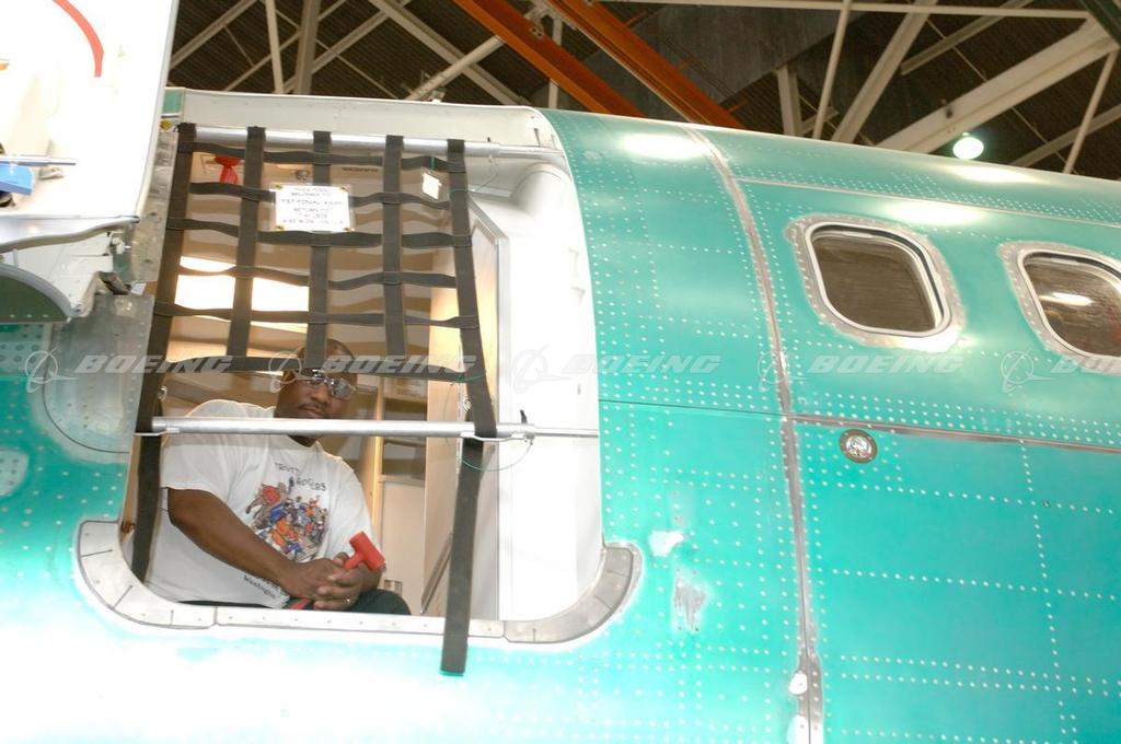 Factory Worker Installing an Emergency Exit on a 737