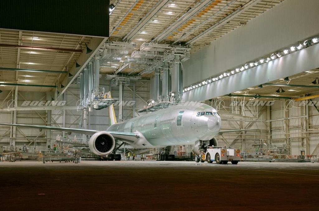 Fully assembled, the 777-300ER (extended range) airplane rolls to the next stage in the manufacturing process – into paint at the factory in Everett, WA. Approximately 35 percent of the 777-300ER’s design is different than earlier 777 models’. One noticeable difference is the airplane’s use of larger and more powerful engines. The airplane is powered by the GE90-115B.