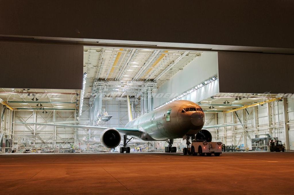 Fully assembled, the 777-300ER (extended range) airplane rolls to the next stage in the manufacturing process – into paint at the factory in Everett, WA. Approximately 35 percent of the 777-300ER’s design is different than earlier 777 models’. One noticeable difference is the airplane’s use of larger and more powerful engines. The airplane is powered by the GE90-115B.