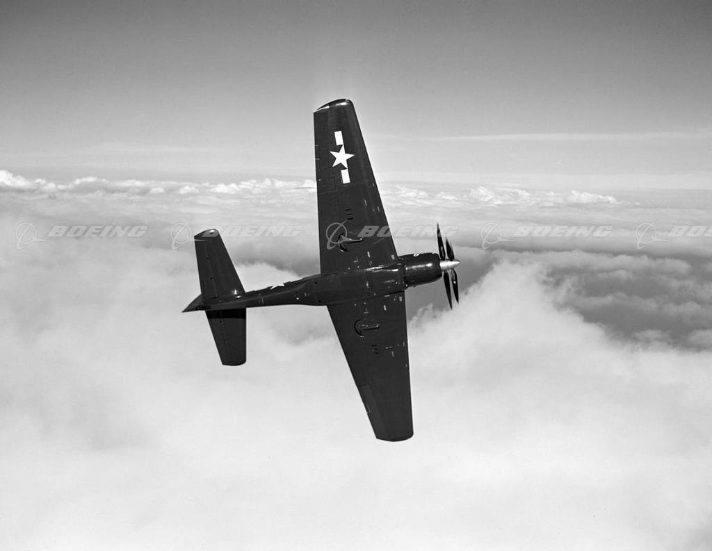 The XF8B-1 fighter-bomber was the heaviest carrier-based airplane built before the end of World War II. It was the first fighter Boeing built after the P-26 Peashooter of 1936 and the last before the F/A-22 in 1990. The XF8B-1 could be flown as a torpedo bomber and, because of its single-seat configuration, could also be used as a fighter. Because of its size and great horsepower, the XF8B-1 used an unusual dual six-blade contrarotating propeller. It carried bombs internally and extra fuel externally, and its six machine guns were mounted inside the folding wings.