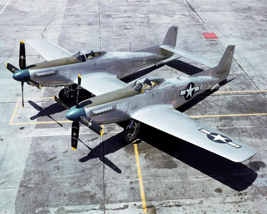 The P-82 Twin Mustang/F-82 Twin Mustang fighter first flew June 15, 1945. Looking like two Mustang fuselages on one wing, its twin cockpits allowed the pilot and copilot to share the workload on long-range missions. During the Korean conflict, the first three North Korean airplanes destroyed by U.S. forces were shot down by F-82G interceptors. The Twin Mustang had a wingspan of 51 feet 3 inches and was 39 feet long. It was adapted as a fighter, long-range escort, reconnaissance airplane, night fighter, attack bomber, rocket fighter, and interceptor.