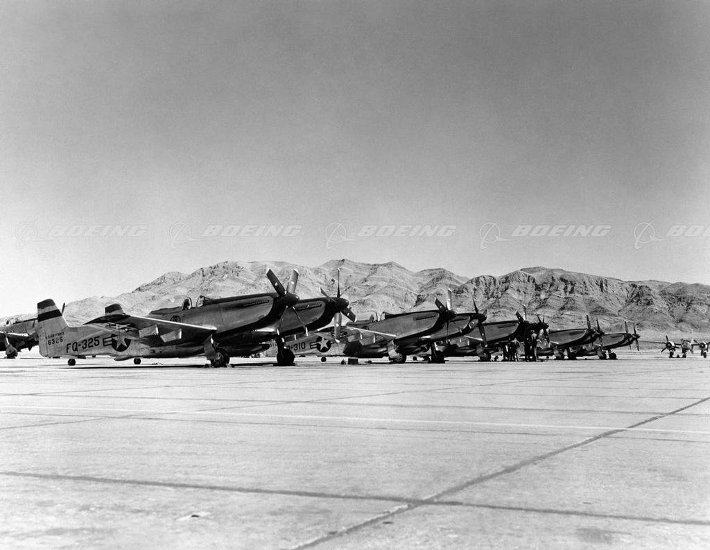 The North American P-82 Twin Mustang was the climactic development of a long series of the famous World War II P-51 Mustang series. North American produced 250 of the double-fuselaged airplanes for the Air Force, embracing three versions of the Twin Mustang then in service, the P-82E, P-82F, and P-82G. The versatility of the P-82 made it potentially adaptable to a wide variety of roles in modern aerial warfare. It could have been used as a fighter, a long-range escort, long-range reconnaissance, night fighter, attack bomber, rocket fighter or an interceptor. With a speed of more than 475 miles an hour, the Twin Mustang had a combat range of over 1,600 miles with full armament. Range could be extended by use of external drop tanks on the wings. A radical departure from the conventional single-fuselage airplane, the Twin Mustang was formed by two fuselages joined by the wing and the horizontal stabilizer. With a pilot in each fuselage, it reduced the problem of pilot fatigue on ultra-long-range missions. The P-82F and G models carried a radar operator in the right cockpit instead of a co-pilot.