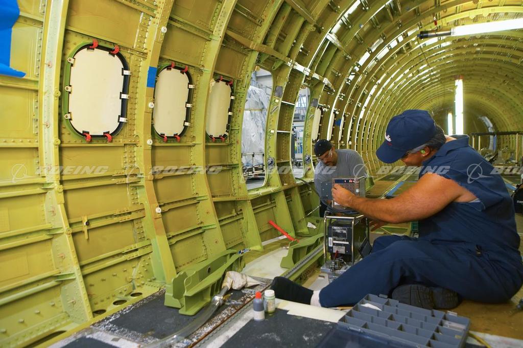 Factory Worker Drilling Floor Panels Inside a 737 Fuselage