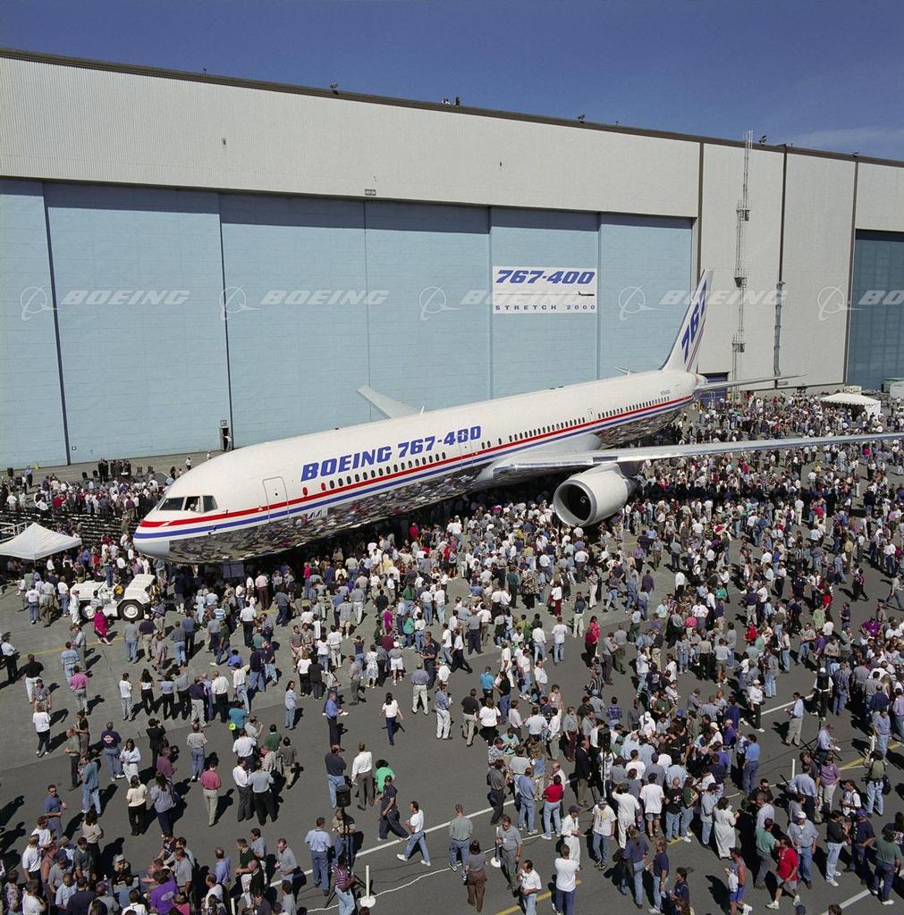 The new Boeing 767-400ER rolled out under sunny skies at the Everett facility today. A crowd of more than 2,000 employees took part in the celebration. The newest members of the 757/767 family offer airlines increased seating capacity, lower costs per seat-mile, and greater market flexibility. Sized between the 767-300 and larger 777-200, the 767-400ER will carry 245 passengers in a typical three-class configuration, and 304 passengers in a typical two-class configuration. The 201-foot-long jetliner features an upgraded flight deck with six large displays for flight and navigation data, and a new passenger cabin designed with curved ceilings and side walls inspired by the award-winning 777 interior.