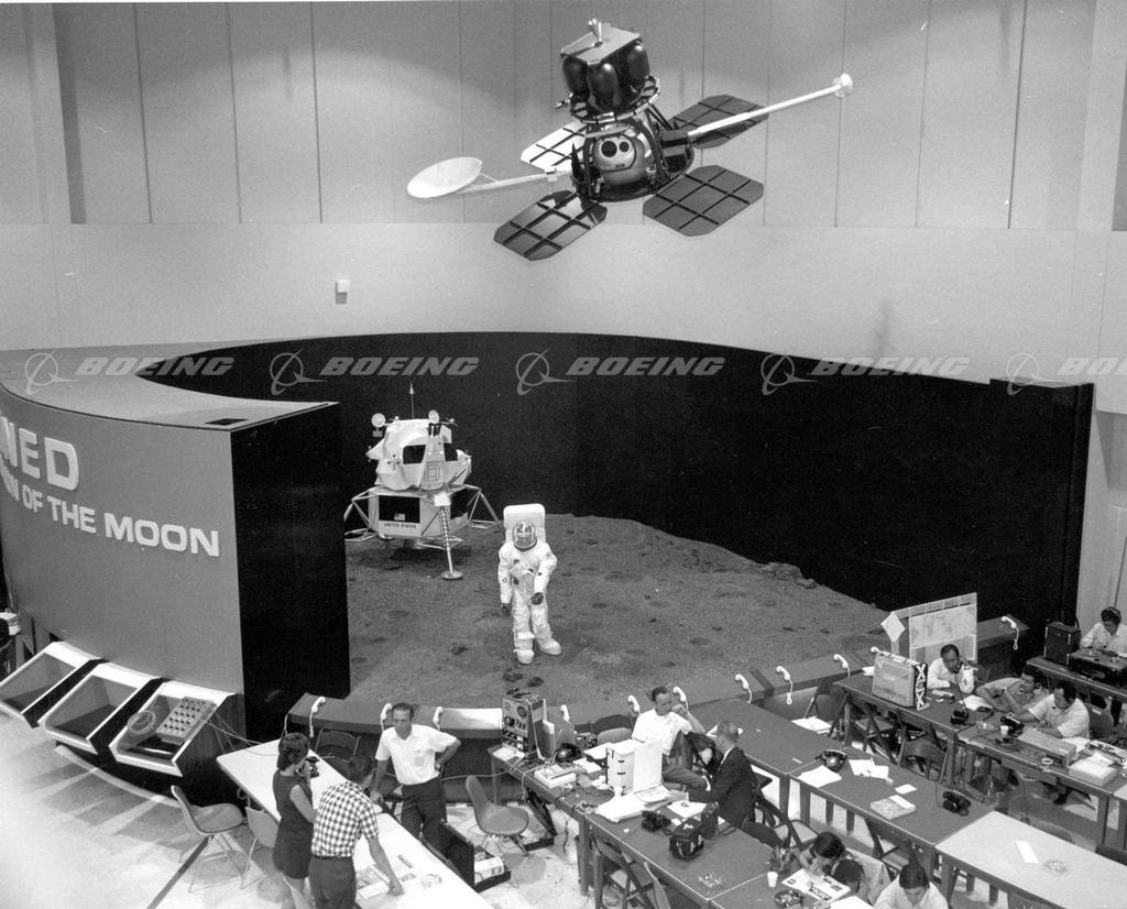 A model of the Boeing-built Lunar Orbiter, which paved the way for the Apollo 11 mission with its close-up photos of the moon, looks down on a mockup of a lunar landscape at the press center in Houston.