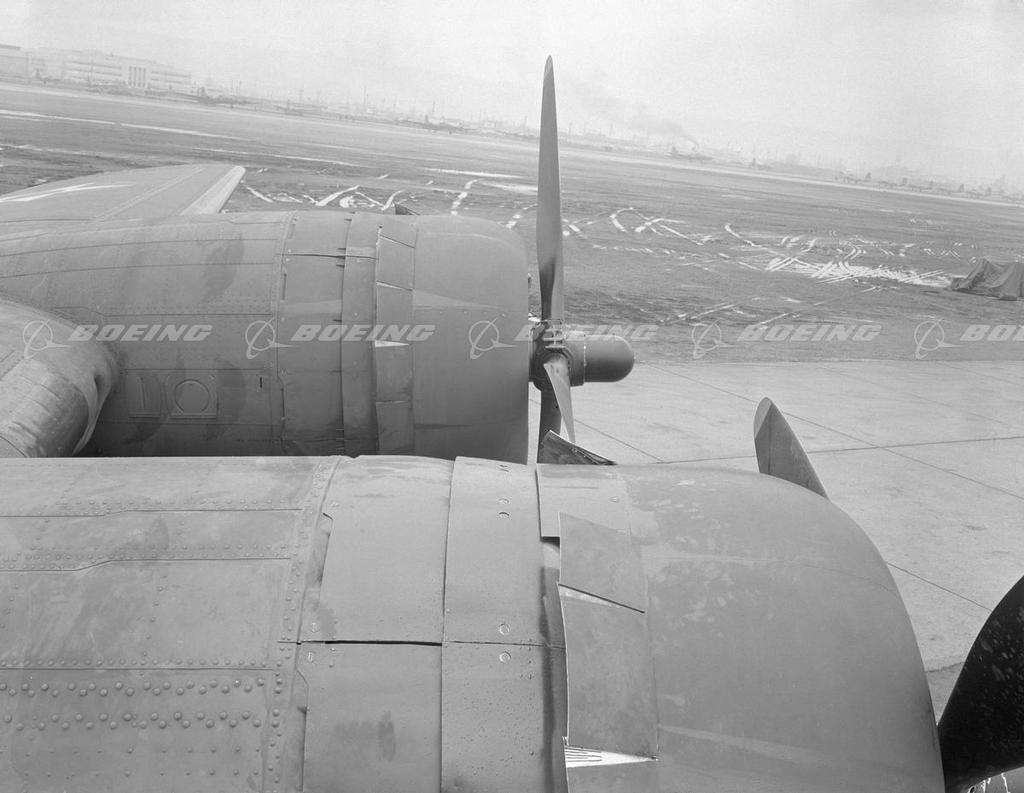 In response for the Army’s request for a large, multiengine bomber, the B-17 (Model 299) prototype, financed entirely by Boeing, went from design board to flight test in less than 12 months. The B-17 was a low-wing monoplane that combined aerodynamic features of the XB-17 giant bomber, still in the design stage, and the Model 247 transport. The B-17 was the first Boeing military aircraft with a flight deck instead of an open cockpit and was armed with bombs and five .30-caliber machine guns mounted in clear blisters. The B-17E, the first mass-produced model Flying Fortress, carried nine machine guns and a 4,000-pound bomb load. It was several tons heavier than the prototypes and bristled with armament. It was the first Boeing airplane with the distinctive - and enormous - tail for improved control and stability during high-altitude bombing. Each version was more heavily armed. In the Pacific, the planes earned a deadly reputation with the Japanese, who dubbed them four-engine fighters. The Fortresses were also legendary for their ability to stay in the air after taking brutal poundings. They sometimes limped back to their bases with large chunks of the fuselage shot off.