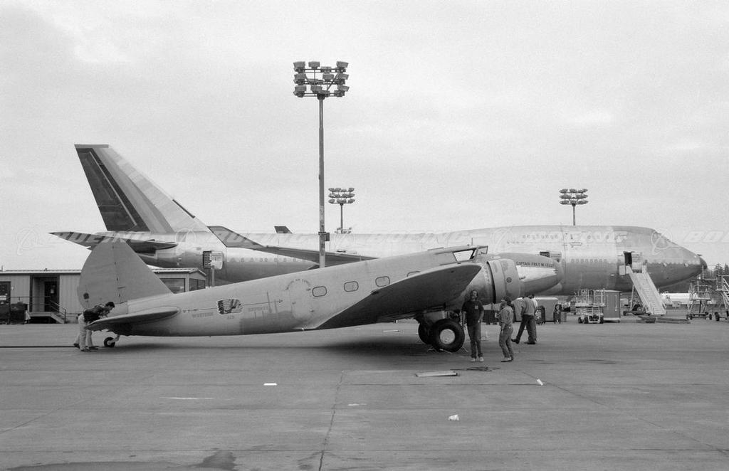 The first modern passenger transport, the Model 247, is contrasted here with a Boeing 747.